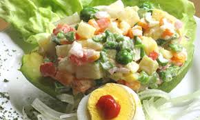 Sancochar la pechuga. En el mismo caldo del pollo, cocer la papa, la zanahoria y las arverjas. Deshilachar la pechuga en un recipiente, añadirle la zanahoria y las papas sancochadas cortadas a cuadritos, aderezar con aceite, sal, pimienta y vinagre. Cortar la cebolla (a lo largo, corte en Juliana) y dejarla remojar en agua. Cortar la palta por la mitad y pelar con cuidado para no romperla. Rellenar la palta con el preparado del recipiente. Esparcirle la cebolla y decorar con las arverjas y el perejil. Se puede adornar también con lechuga cortada en Juliana.