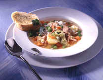 Se ponen a hervir las carnes con la cebolla picada, la hoja de laurel y el caldo Knorr durante media hora. Luego se agregan las verduras y se deja hervir 15 minutos más.
